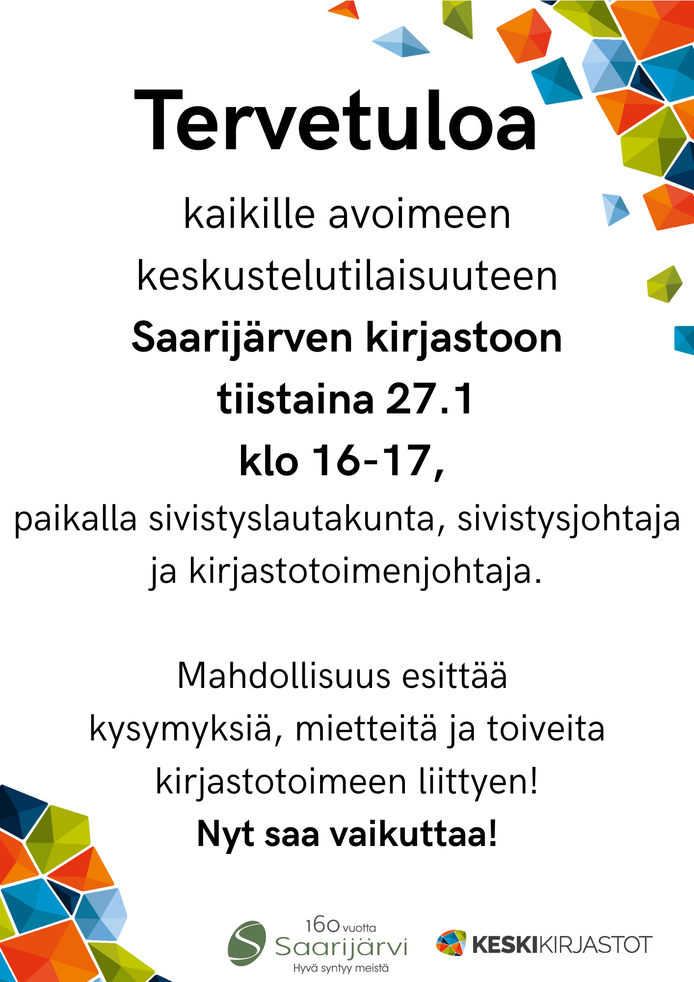 Saamme sivistyslautakunnan vieraaksemme kirjastoon tammikuun lopussa keskustelemaan kirjastotoimeen liittyvistä asioista, tule sinäkin mukaan!