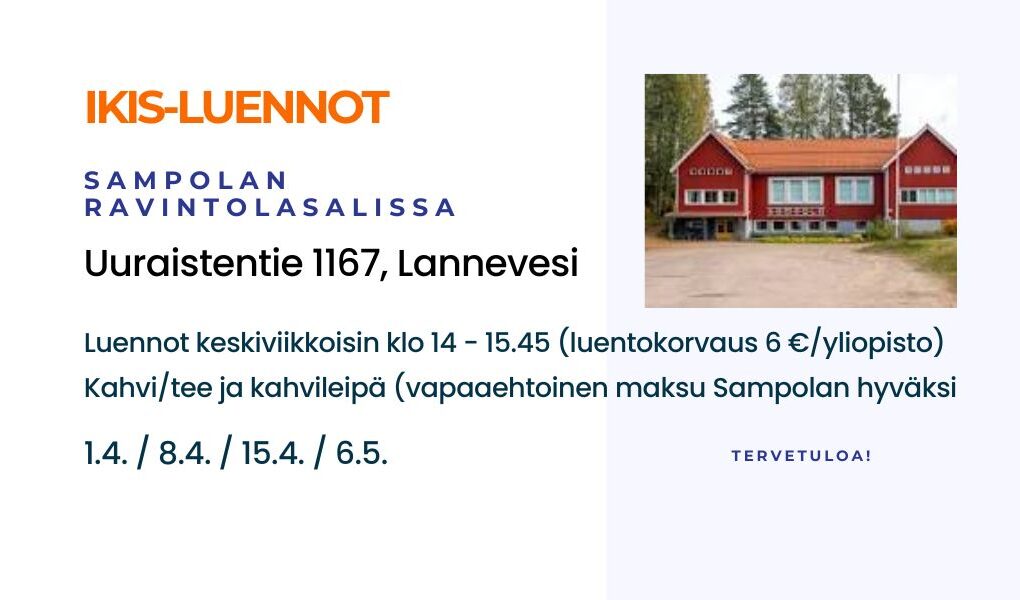 Jyväskylän Ikääntyvien yliopiston luentoja striimataan Sampolassa (luennot, joita ei ole mahdollista seurata Saarijärvi-salissa). Yliopiston luentokorvaus 6 €/hlö/luento. Iltapäiväkahvi tai -tee, kahvileipää. Vapaaehtoinen maksu Sampolan hyväksi.