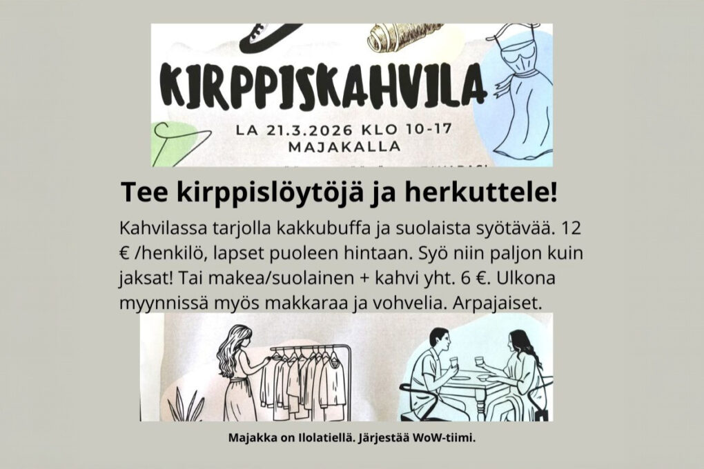 Kirppiskahvila yhdistää kirpputorimyynnin ja herkuttelun. Majakan tiloissa, Ilolantiellä, pääsee herkuttelemaan, tapaamaan ihmisiä ja tekemään samalla hyvää. Kirppislöytöjen lisäksi on kakkubuffa, jossa on suolaisia ja makeita herkkuja. Majakan terassilla on makkaran ja vohvelin paistopiste.