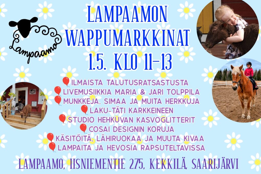 Lampaamon Wappumarkkinat tarjoaa perinteisin menoin ilmaista talutusratsastusta suomenheppa Sikellä (myös aikuisille), loistavaa livemusiikkia, lähiruokaherkkuja, käsitöitä, tilan eläinten rapsuttelua ja leppoisaa markkinatunnelmaa 🥳 Lämpimästi tervetuloa mukaan koko perheen tapahtumaan! ❤️